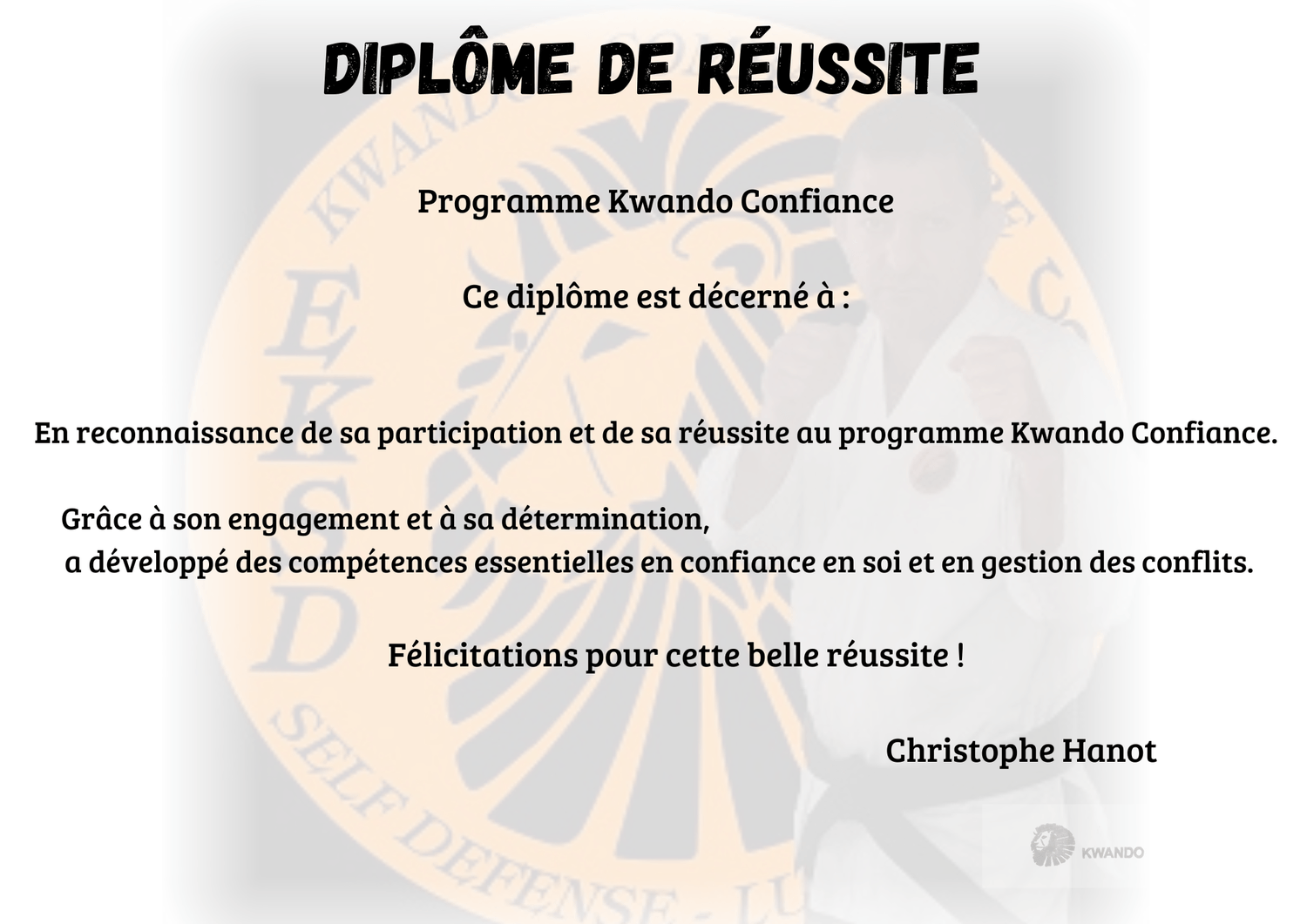 "Je m'appelle Christophe Hanot et j'ai créé le Système KWANDO. Avec plus de 30 ans d'expérience dans les arts martiaux, les sports de combat et l'accompagnement des enfants, j'ai conçu un programme pratique et accessible pour aider les parents à transmettre à leurs enfants les clés de la confiance et de la gestion des conflits. Grâce à mes méthodes et au programme de 5 modules et plus de 32 chapitres et 60 vidéos mis à jour régulièrement, l'association EKSD à déjà aidé des centaines d'enfants à s'affirmer et à se protéger efficacement."